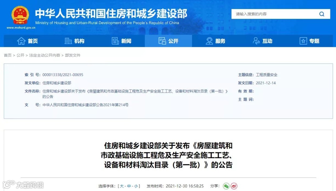 2021年12月14日,住建部印发的《房屋建筑和市政基础设施工程危及生产安全施工工艺、设备和材料淘汰目录(第一批)》明确: