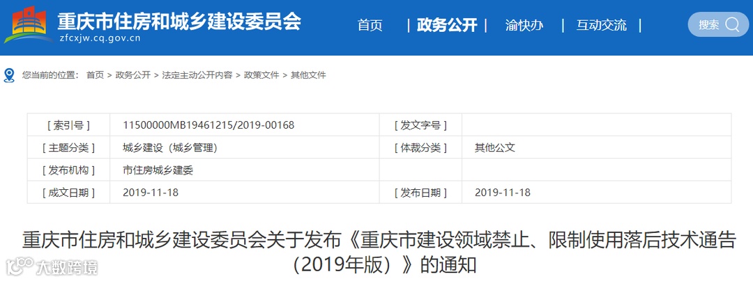 为适应行业高质量发展需要,进一步推动新技术工程应用,促进行业技术创新和转型升级发展,提高行业建设技术、工程质量和安全生产水平,根据《建设领域推广应用新技术管理规定》(建设部令第109号)和《重庆市建设领域推广应用新技术管理办法》(渝建发〔2010〕65号),编制形成了《重庆市建设领域禁止、限制使用落后技术通告(2019年版)》(以下简称《技术通告》),现予以发布,并将有关要求通知如下: