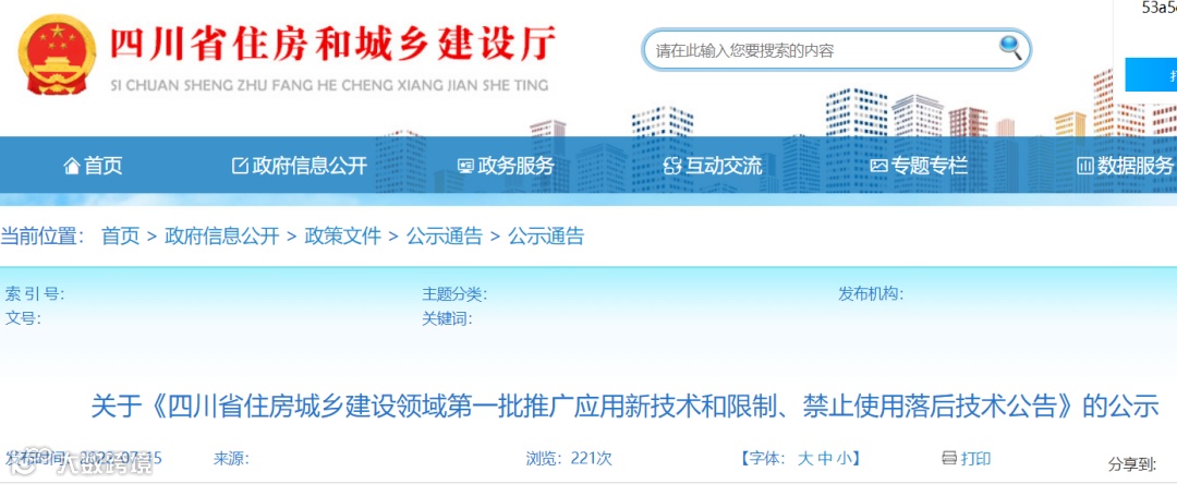 根据《四川省住房城乡建设领域新技术推广应用管理办法(试行)》(川建行规〔2022〕4号)相关要求,按规定完成公开征集、专家评审等程序,拟将以下技术列入《四川省住房城乡建设领域推广应用新技术和限制、禁止使用落后技术公告(第一批)》,现予以公示,公示期5个工作日(2022年7月15日至7月21日)。公示期内,任何单位和个人如对公示内容有异议,可通过电话、书面方式向勘察设计与科学技术处联系。