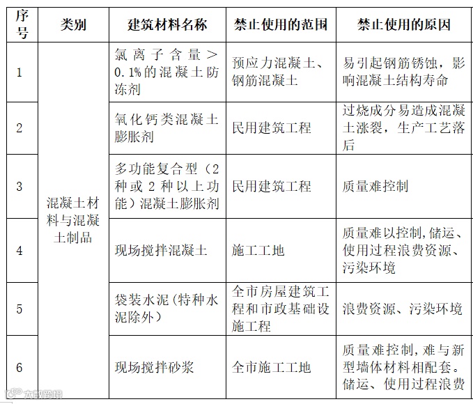 | 10 | 建设用砂 | 氯离子含量大于0.02%的建设用砂 | 禁止在预拌混凝土和预拌砂浆中使用 |