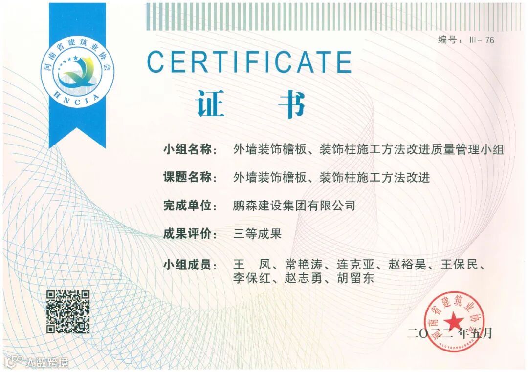 近日,由河南省建筑业协会举办的2022年工程建设质量管理小组活动专家组对提交的2022年河南省工程建设质量管理小组活动成果,进行了初审、发表和交流等环节的综合评价,鹏森建设集团有限公司QC小组发布的QC成果《外墙装饰檐板、装饰柱施工方法改进》,荣获2022年河南省工程建设质量管理小组活动成果三等成果。