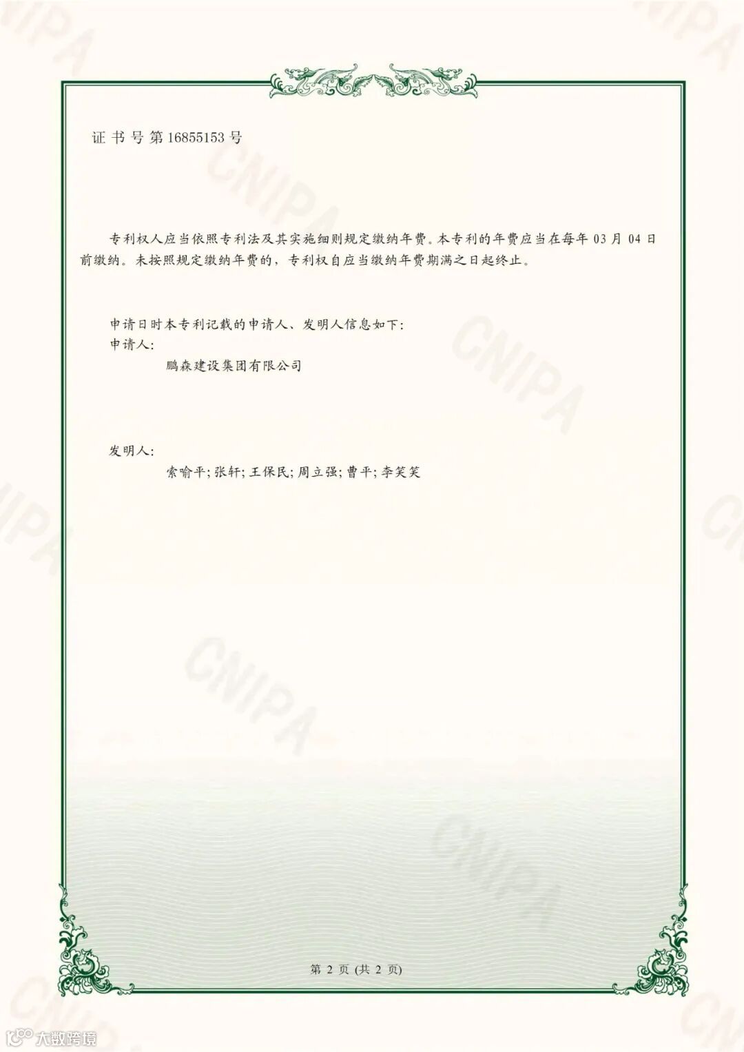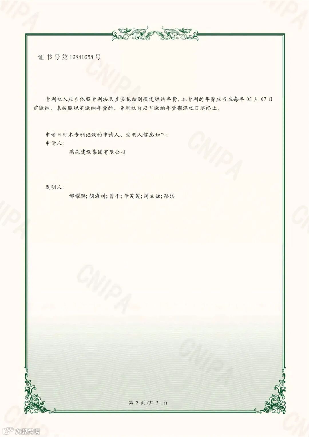 近年来,鹏森集团高质量做好劳模和工匠人才创新工作室的创建工作,培养技术人才,促进创新科技与企业发展密切结合,取得了一定的实效。新型专利权的取得,标志着鹏森建设集团有限公司在技术创新方面又迈上了一个新的台阶,不仅为公司创造经济效益,还对增强企业市场竞争力和品牌影响力有重要的意义。