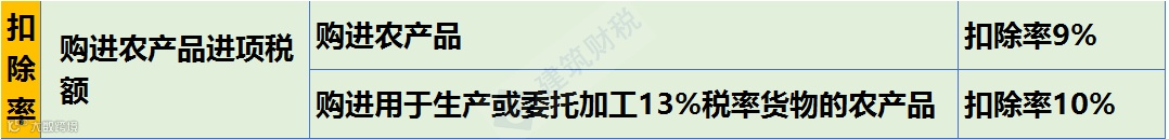 o 购进农产品用于生产经营且不构成货物实体的(包装物、辅助材料、燃料、低值易耗品):最终货物税率为9%时扣除率为9%;最终货物税率为13%,扣除率为10%。