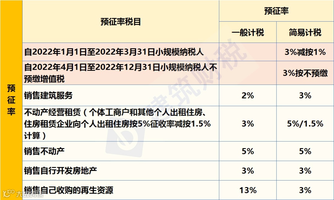 目前主要针对不动产和建筑行业采用预征办法,主要有5%、3%和2%的档次。