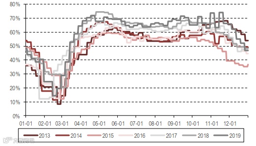 建筑行业有明显的周期性,春节后开工时间往往慢于其他行业,且由于春季雨水较多,施工强度远不及三四季度。不少建筑设计企业往年春节假期至少持续到元宵后,施工单位往往更晚。参照往年水泥磨机开工率数据,1 月份后全国平局磨机开工率下降,1 月底-2 月初是低点,后逐步回升,但速度较慢,往往要到 4 月中下旬全国水泥磨机开工率才能达到 60%-70%的正常水平。这意味着平常年份至少要到 4 月中下旬建筑行业施工强度才能恢复到正常水平。从重点省份玻璃库存也可以进一步验证,因为 1-2 月份施工强度较低,重点省份库存上升一直到 3 月份达到高点。随着施工强度逐步恢复,4 月份达到正常水平,往年重点省份玻璃库存要到 5 月份才会明显下降。综合参考水泥和玻璃季节性数据,我们认为建筑行业复工时间较晚,施工强度恢复较慢,本次疫情导致春节假期延后对建筑行业开工影响较小。