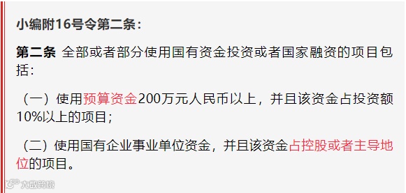 (一)关于使用国有资金的项目。16号令第二条第(一)项中“预算资金”,是指《预算法》规定的预算资金,包括一般公共预算资金、政府性基金预算资金、国有资本经营预算资金、社会保险基金预算资金。第(二)项中“占控股或者主导地位”,参照《公司法》第二百一十六条关于控股股东和实际控制人的理解执行,即“其出资额占有限责任公司资本总额百分之五十以上或者其持有的股份占股份有限公司股本总额百分之五十以上的股东;出资额或者持有股份的比例虽然不足百分之五十,但依其出资额或者持有的股份所享有的表决权已足以对股东会、股东大会的决议产生重大影响的股东”;国有企业事业单位通过投资关系、协议或者其他安排,能够实际支配项目建设的,也属于占控股或者主导地位。项目中国有资金的比例,应当按照项目资金来源中所有国有资金之和计算。