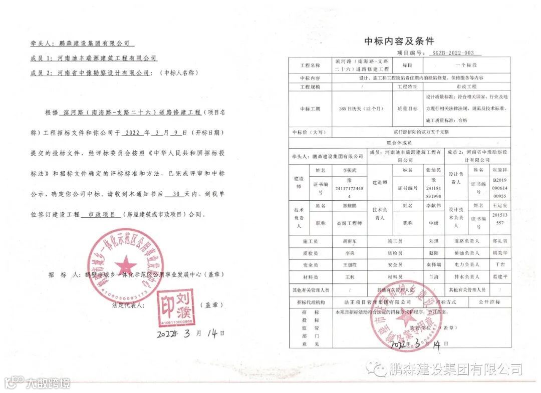 3月14日,我公司(鹏森建设集团有限公司)在滨河路(南海路-支路二十六)道路修建工程项目的竞标中,凭借过硬的产品质量,扎实高效的工作作风,卓越的运作团队和良好的企业信誉,以绝对优势顺利中标。在此特向大家通报喜讯。此次中标是对鹏森建设集团综合实力、技术水平的一次认可。脚下的路,任重而道远,鹏森建设集团将以此为动力,不断开拓创新,砥砺前行!