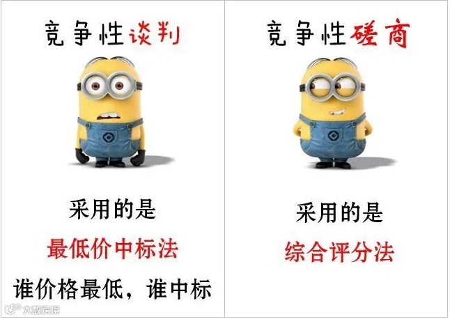 从中可以看出,两者之间,在评标方法上的区别是最大的,竞争性磋商采用的是综合评分法,竞争性谈判采用的是最低价中标法。所以根据这个评审方法,我们可以理解为谈判比较直接,谁价格低谁就中标,前提是符合谈判文件的要求,没有实质性偏离,那么一轮结束,再也没有商量的余地。但是磋商稍微复杂,要制定详细的综合评分要求,要打分,最后未必是最低价中标,而且磋商的过程中,投标单位可选择价格调整策略,整体的评标过程还是稍微复杂的。从这上面我们也可以分析出,谈判更直接更简单,因此他在时间上也相对快速,竞争性谈判比竞争性磋商在时间上更短、更加灵活。