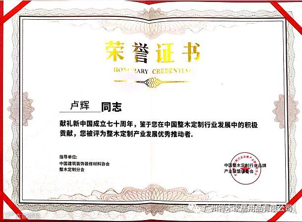 很荣幸我公司-广州祥木家居荣获荣誉证书