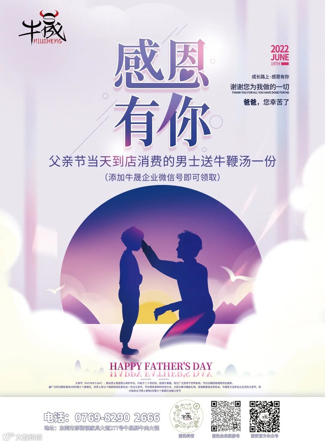 父亲节当天到店消费的男士,添加牛晟企业微信号,即送牛鞭汤一份哦,数量有限,先到先得~