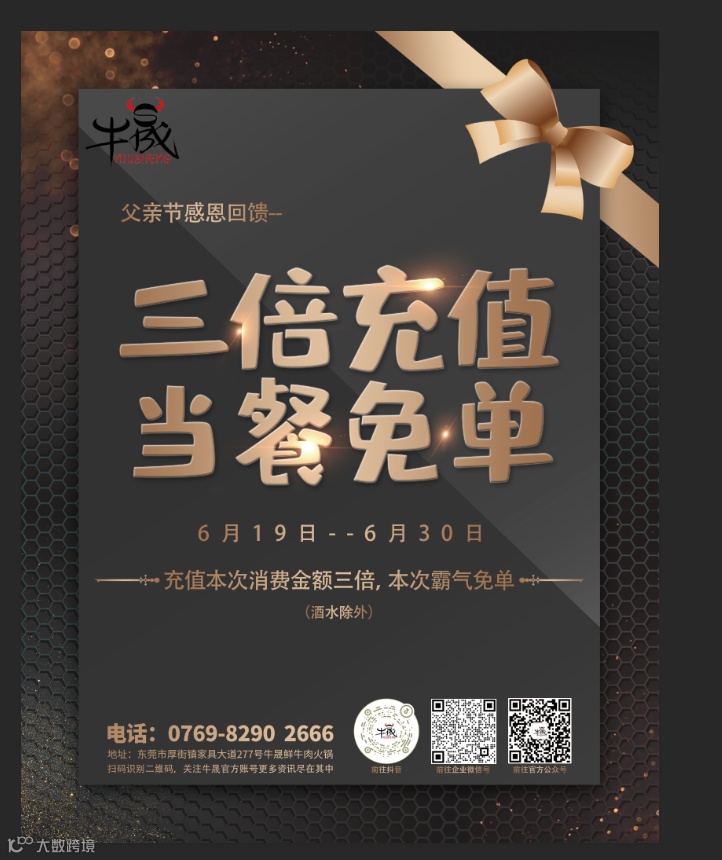 父亲节当天至本月30日,充值当餐消费金额三倍,老板请客,本次霸气免单!美食有价,父爱无价,来牛晟送父亲一张牛晟至尊会员卡吧~