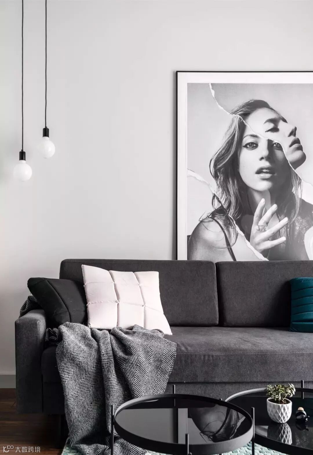 亮眼的抱枕依偎在麻黑色的沙发中