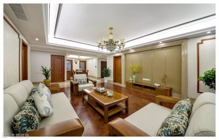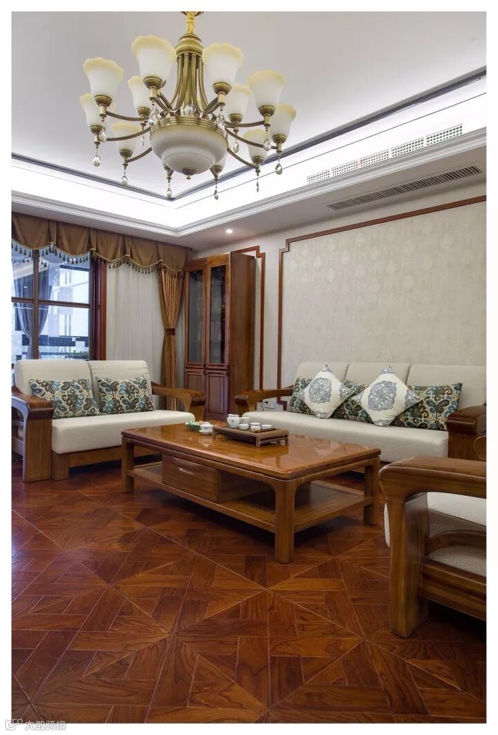 古色古香的客厅,地面采用多层实木拼花地板,纵横交错热压成型的多层实木板能够更好的对抗热胀冷缩,减少变形。