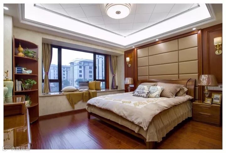 在古韵萦绕的卧室空间软包背景墙尤为凸显,软包背景所采用的木制品规格、等级等全部符合木结构工程施工及验收规定规范,安全又美观。