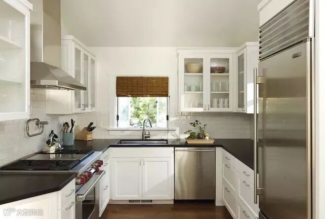 采用U字型橱柜进行布置,符合人的操作动线。左侧吧台靠墙,兼做餐桌; 右侧吊柜包住抽油烟机,看起来整洁些。窗户不变,保证通风和光线。