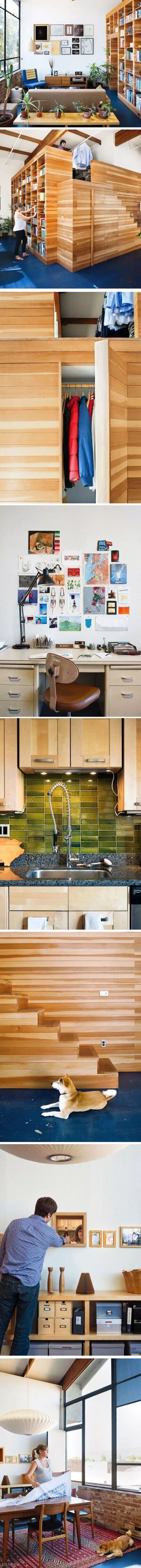 加州一对夫妇Peter和Lynda每天的生活起居都围绕着一个16x17x10英尺的多功能大木箱展开。这幢住宅的前身是一间工厂,Peter决定以阳光充足的客厅的为起点,架设起一面书柜,另一侧延伸为隐形衣柜与楼梯的结合体,鉴于层高较高,顶部的更衣室也令空间利用率最大化。