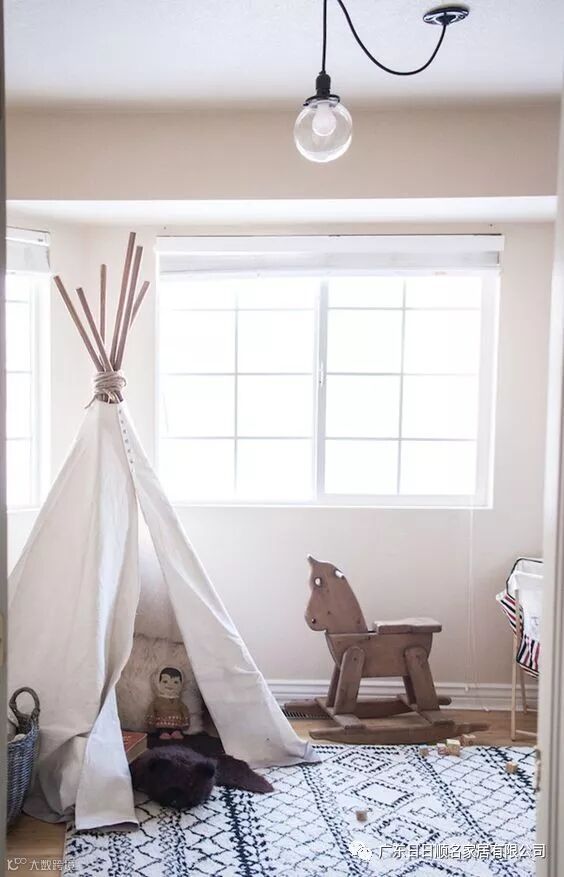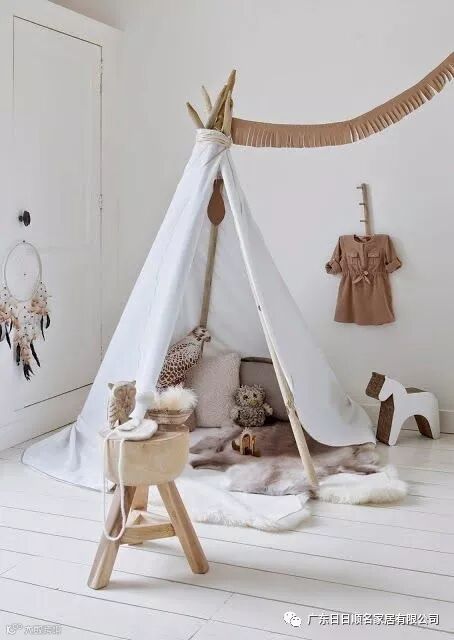 儿童房其实还有很多的“配件”各自有自己小秘密的空间,比如儿童房有一个圆锥形的帐篷中,地板上铺设了地毯,房中放满了泰迪熊和各种洋娃娃,木制玩具具有更高的安全性。彩色的运用充满童趣。