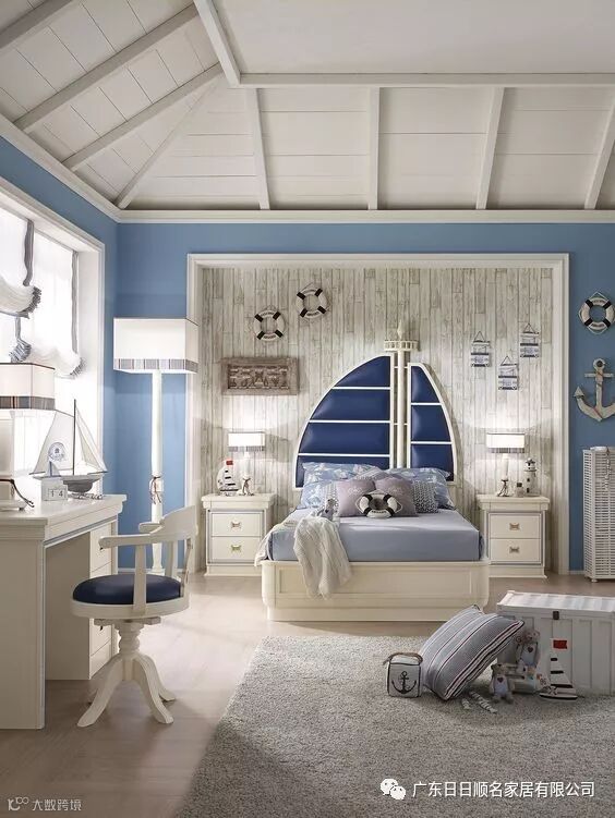我喜欢你,那喜欢像大海一样深。完全的海洋风主题儿童房当然就要有蓝色的海洋和白色的云朵了,所以淡蓝色的墙面将整个空间都包容进去。