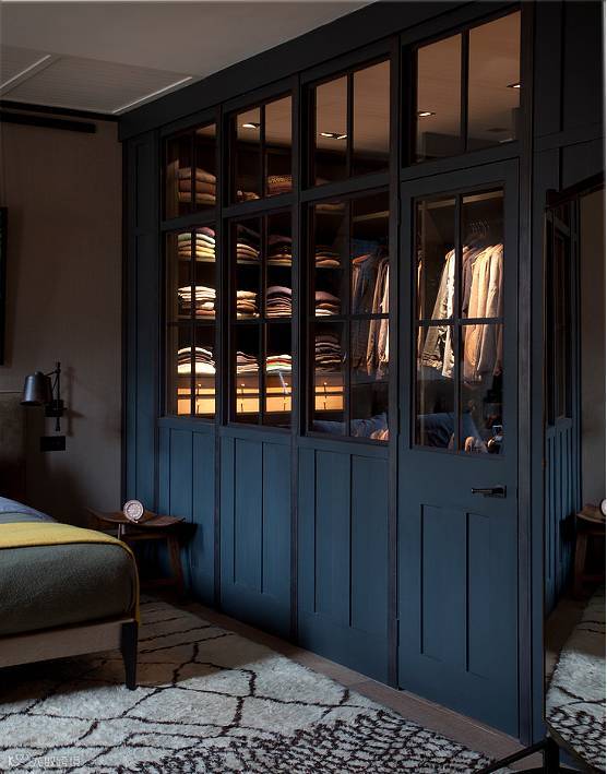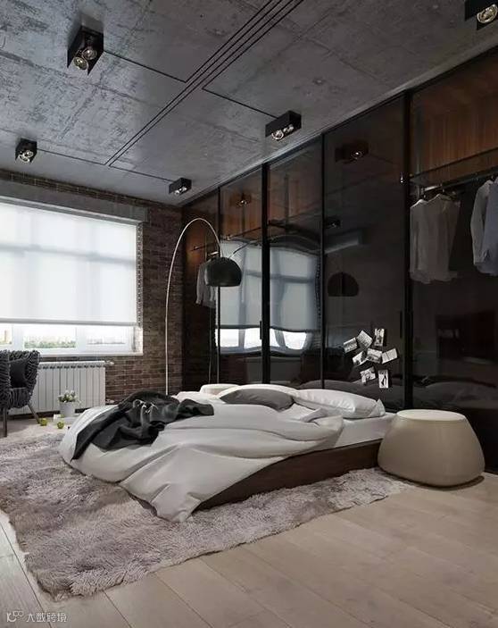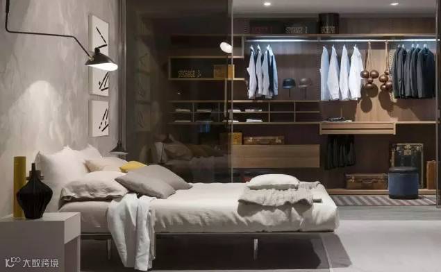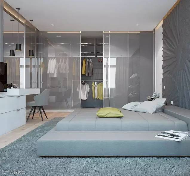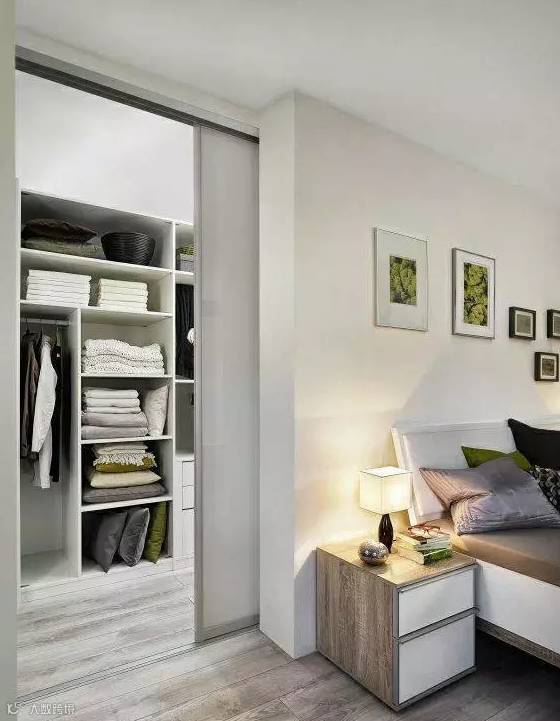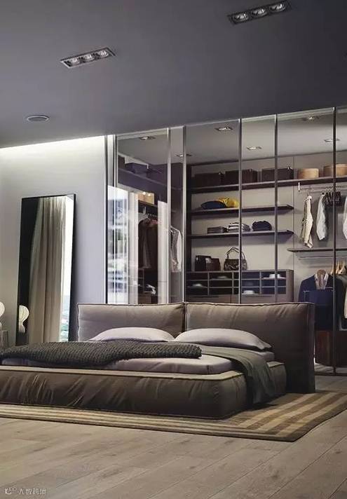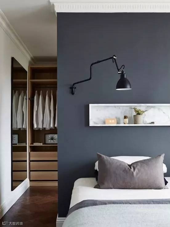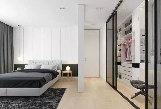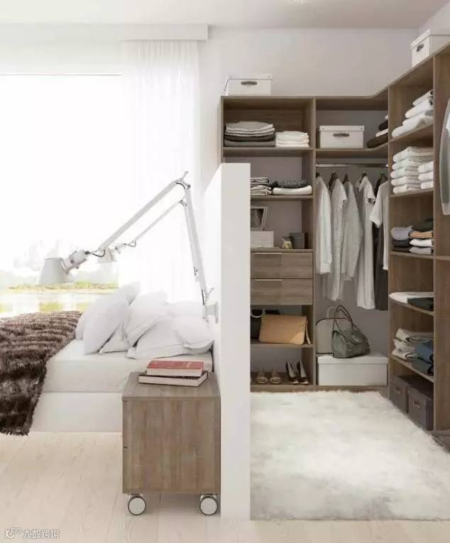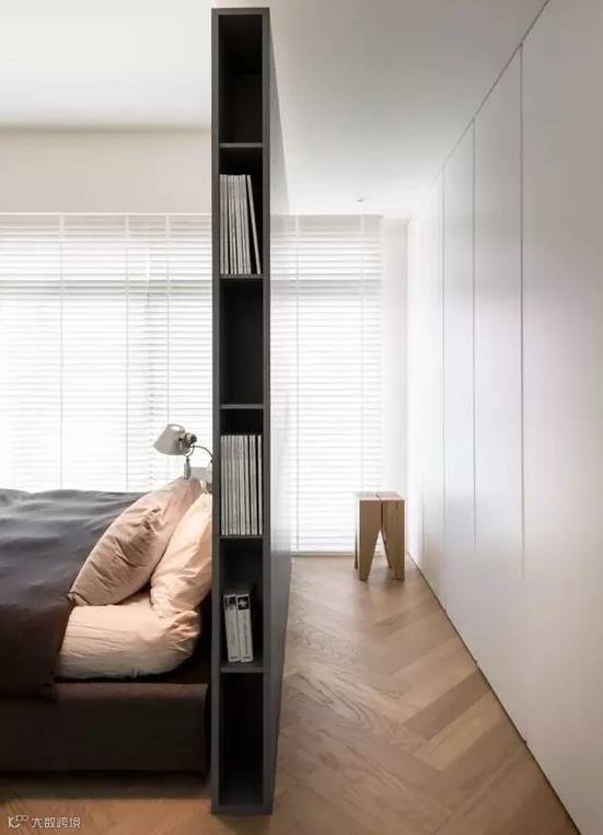 长度足够的卧室,可以以床头为界线,利用实体隔断来隔出一个衣帽间,就能同时保证采光与隐私,不失为一种非常实用的选择。