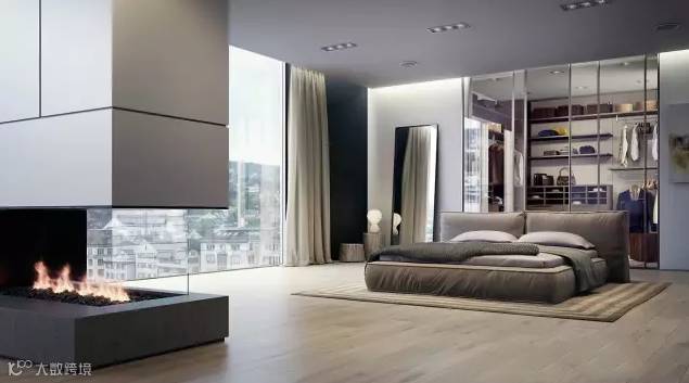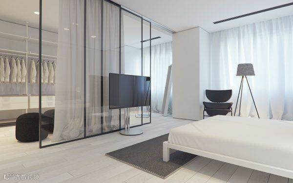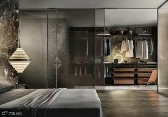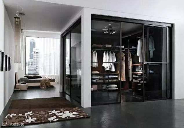 用玻璃隔断来划分卧室空间与衣帽间,是一种非常流行的装修方式。这样做的好处是既能防止灰尘堆积,又能营造通透的视觉感。