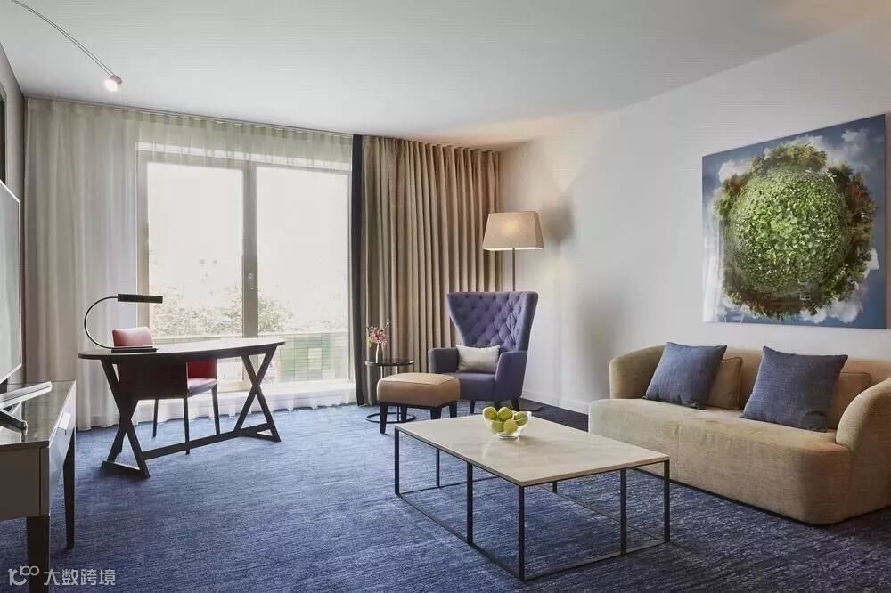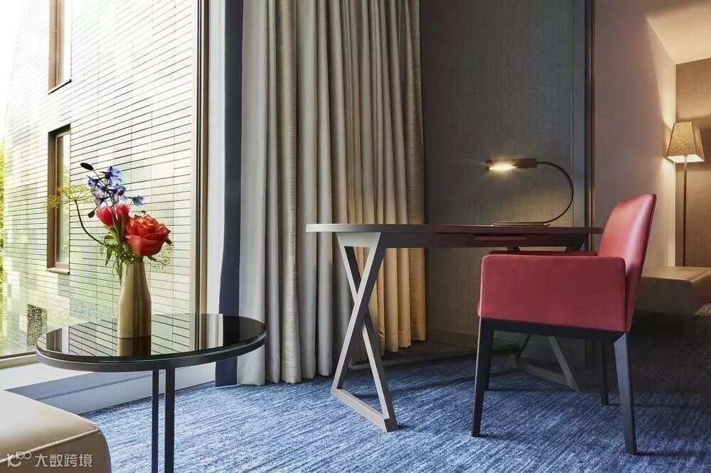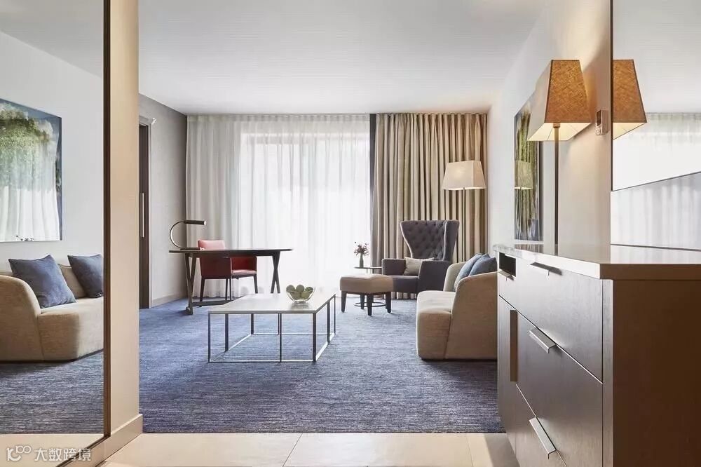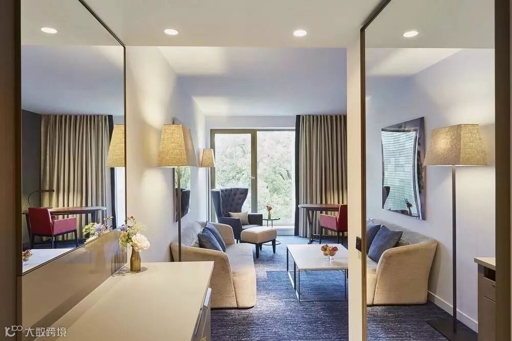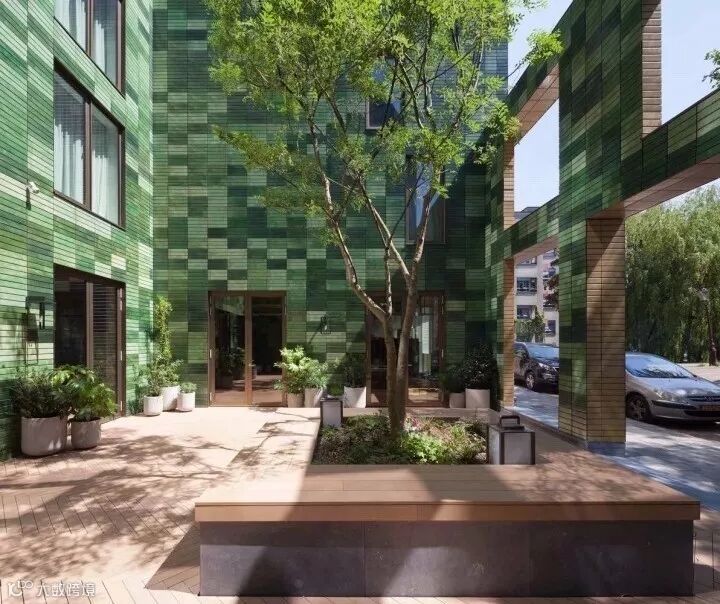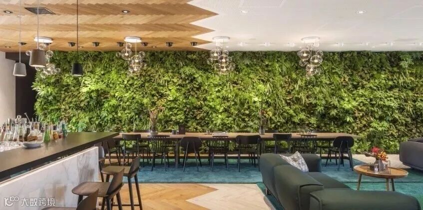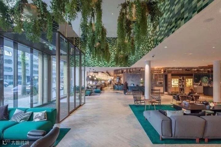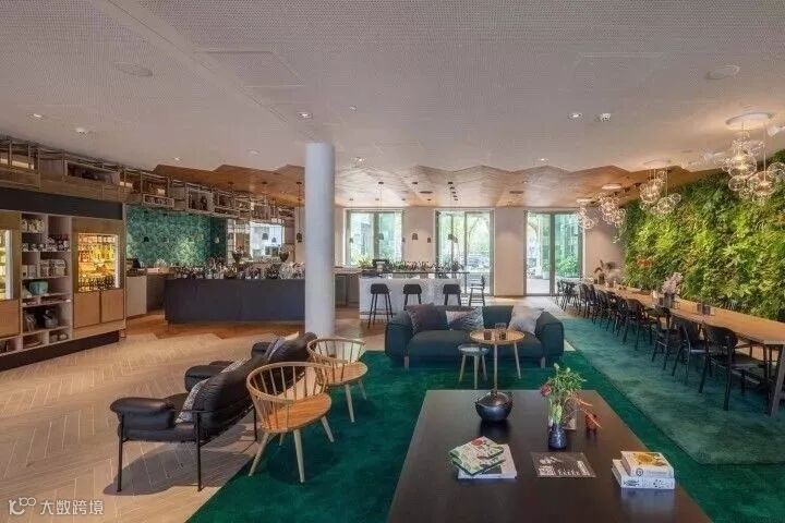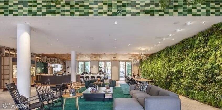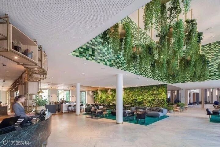 酒店入口有一个拔高的中空,空中挂满了绿植,酒店的大堂休息吧有一个大面积的绿植墙,营造了一个自然而当代的花园式休息厅。