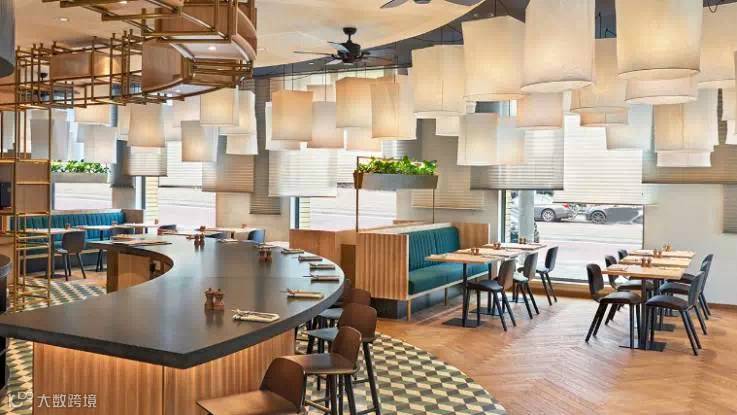 酒店的大堂、大堂吧及餐厅互连互通,我们见到的吊灯,源自东方的设计元素让整个设计仿佛有种文化的穿越。