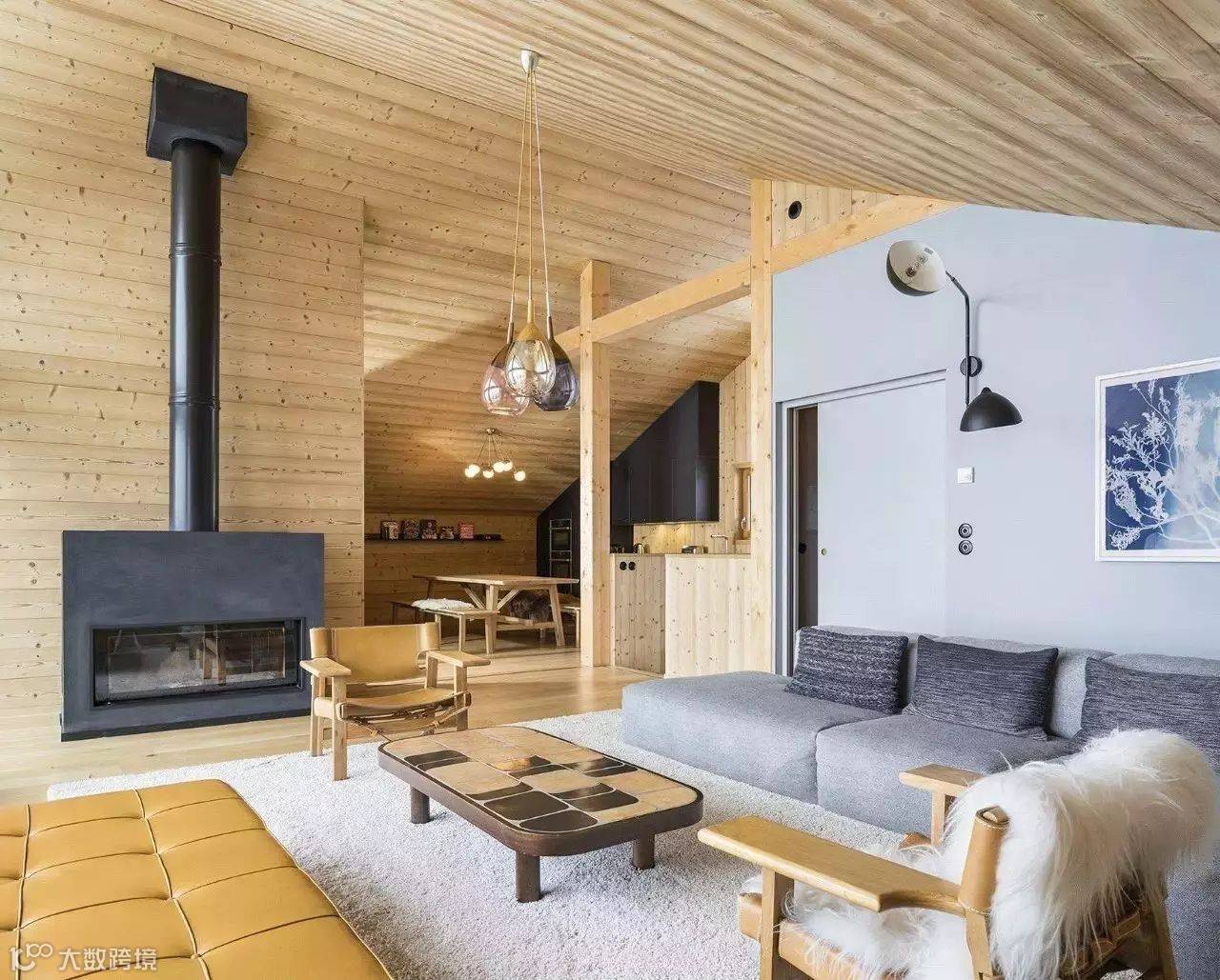 板材拼接,原木做吊顶,别致的造型,处处彰显文艺范儿。粗糙的木质散发出原始自然的森林气息。温润的原木色也能为视觉带来舒缓作用。