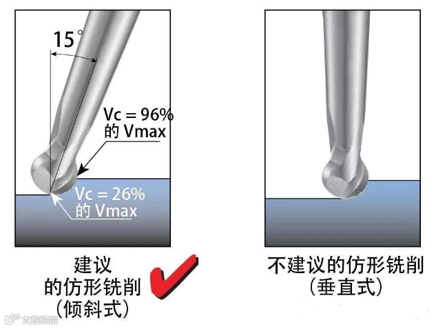 加工时建议将刀具倾斜 15º。此方法可避免在刀具轴以近乎为零的速度切削。这时切削更高效,还能大幅提高刀具使用寿命。降低了切削力。出色的表面粗糙度和亮度。