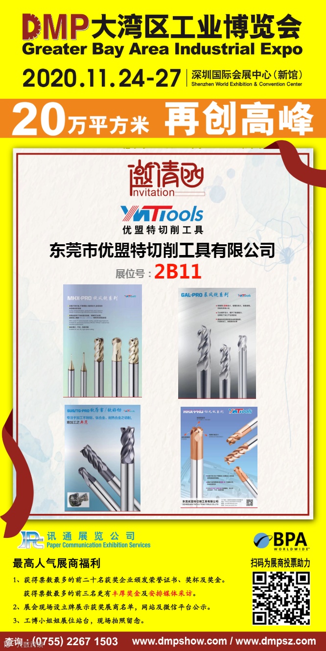 我们将于2020年11月24日-27日参加2020大湾区工业博览会第二十三届DMP国际模具、金属加工、塑胶及包装展,届时将有精彩的产品等待着您,期待您的光临!