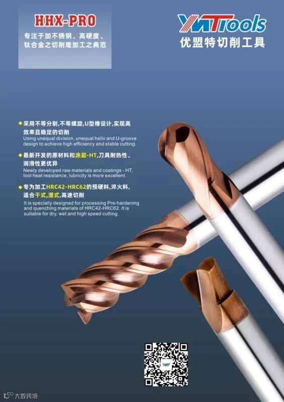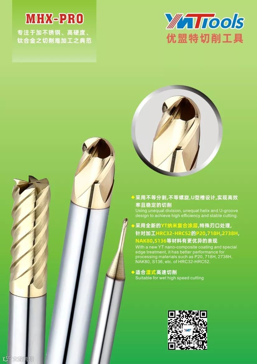 采用全新的YT纳米复合涂层,特殊刃口处理,针对加工HRC32-HRC52的P20,718H,2738H,NAK80,S136等材料有更优异的表现。