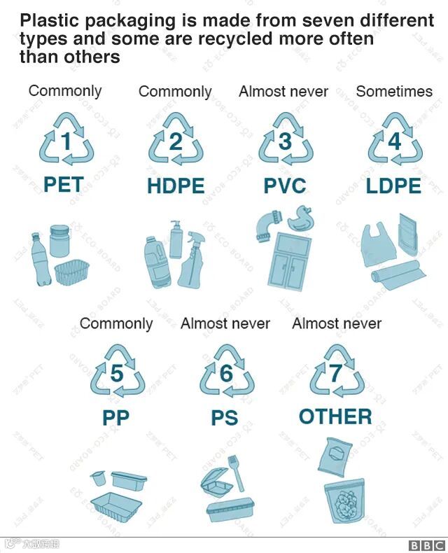 这些图标想必大家都不陌生,我们的PET就是其中的首类环保塑料,可直接用于食品包装和医疗用品。
