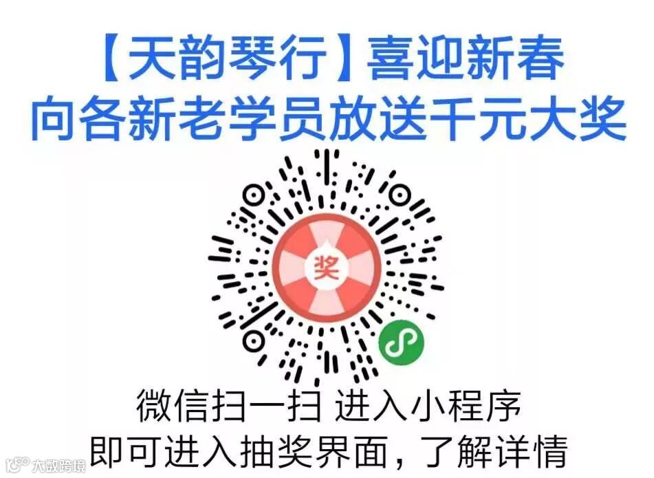 天韵琴行还对各位新老学员推出千元大奖,一等奖388元立减卷,二等奖288元立减卷,三等奖188元立减卷,数量有限先到先得哦!快用微信扫一扫识别下方小程序进入 即可直接参与抽奖啦!