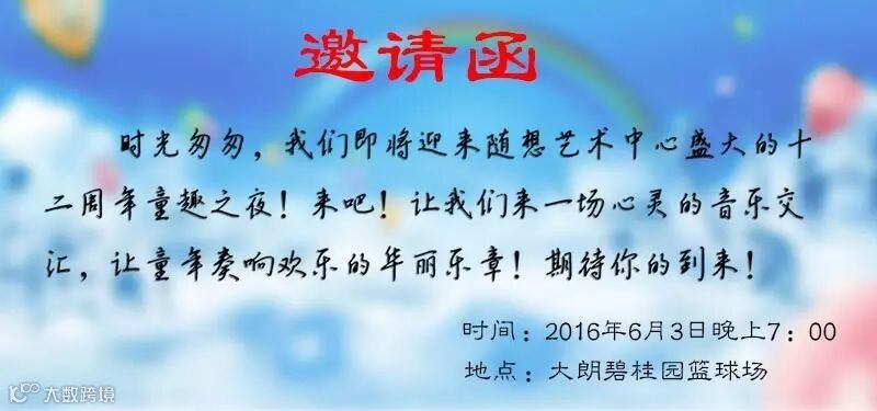 随想艺术培训中心12周年&碧桂园莞深区域活动----“飘扬童趣之夜”音乐会将于2016年6月3日晚上7点隆重举行!活动内容形式多样!奖品礼品丰富!大朗镇碧桂园篮球场约定你!欢迎大家前来参加!