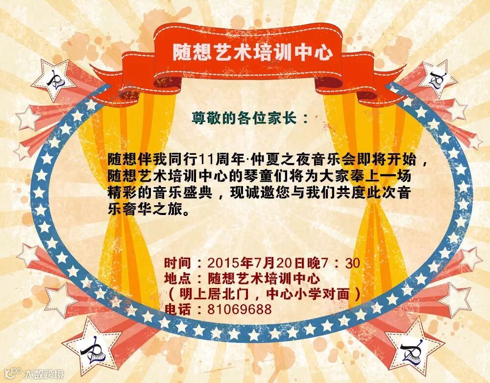 随想艺术培训中心、卷卷毛童装、东莞农商银行系列活动:随想音乐·伴我同行11周年之“仲夏之夜音乐会”,将于7月20日晚上7点30分在随想音乐厅隆重举行。音乐会内容形式多样,卷卷毛童装和东莞农商银行赞助的奖品礼品丰富,欢迎大家前来参加!