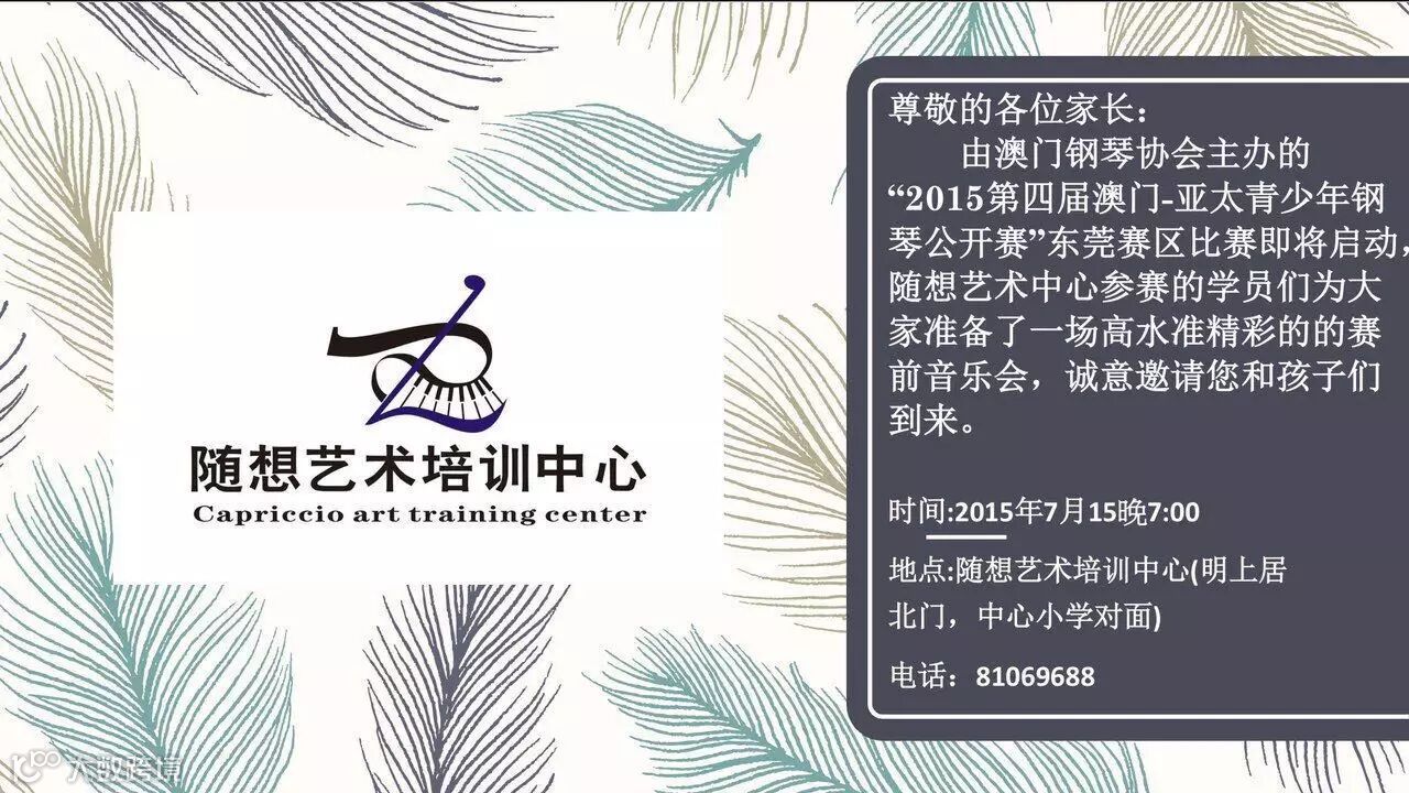 随想艺术培训中心携手卷卷毛童装于7月15日晚上七点举办“亚洲钢琴比赛-畅享音乐会”,欢迎大家前来观看。