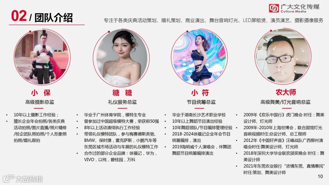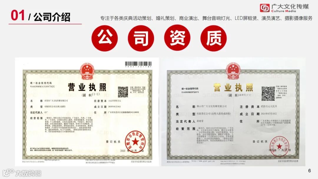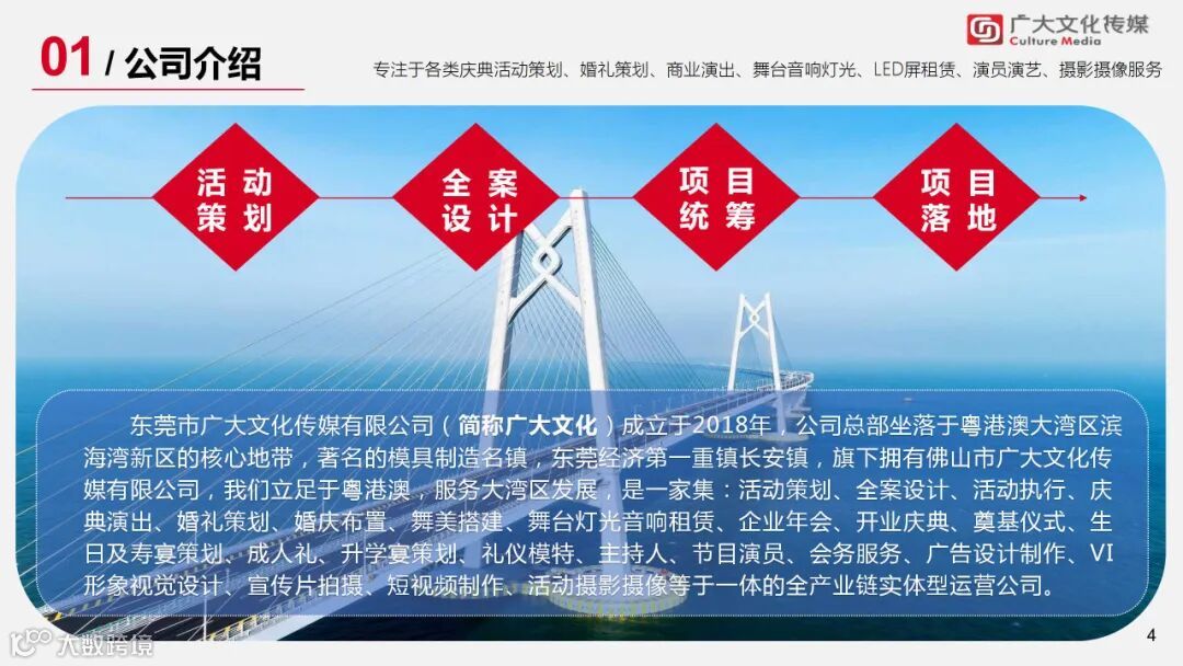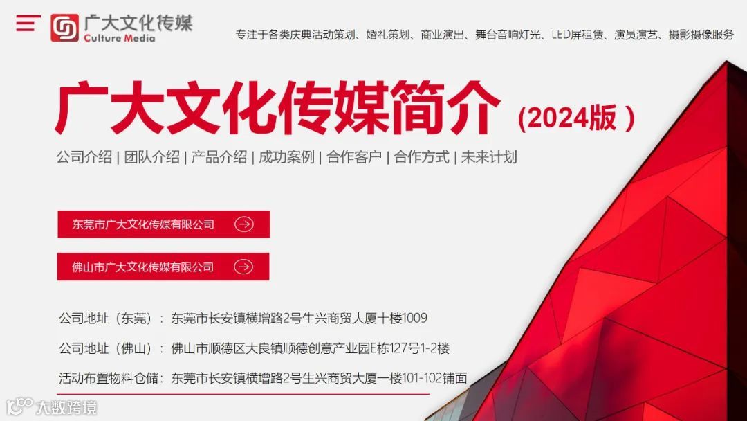 广大文化传媒有限公司(简称广大文化)成立于2018年,公司总部坐落于粤港澳大湾区滨海湾新区的核心地带,著名的模具制造名镇,东莞经济第一重镇长安镇,旗下拥有东莞市广大文化传媒有限公司、佛山市广大文化传媒有限公司,广大文化传媒共享物料仓;我们立足于粤港澳,服务大湾区发展,是一家集:活动策划、全案设计、活动执行、庆典演出、婚礼策划、婚庆布置、舞美搭建、舞台灯光音响租赁、企业年会、开业庆典、奠基仪式、生日及寿宴策划、成人礼、升学宴策划、礼仪模特、主持人、节目演员、会务服务、广告设计制作、VI形象视觉设计、宣传片拍摄、短视频制作、活动摄影摄像等于一体的全产业链实体型运营公司。