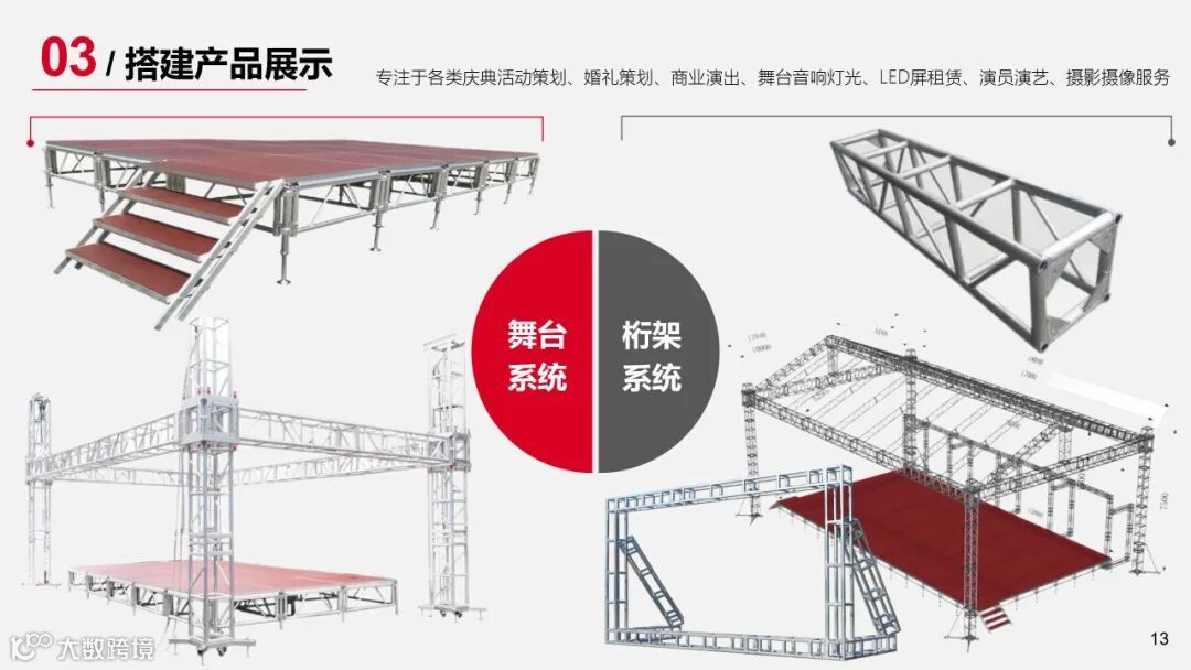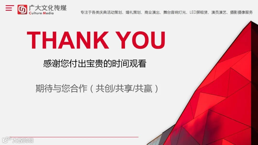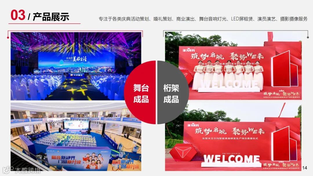 专注于全案策划、庆典活动、会务服务、活动执行、商业演出、舞台音响灯光LED屏租赁、演员演艺、摄影摄像、企业宣传片拍摄、婚庆策划、庆典物料出租服务