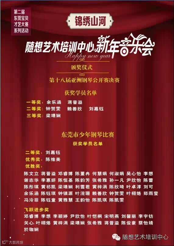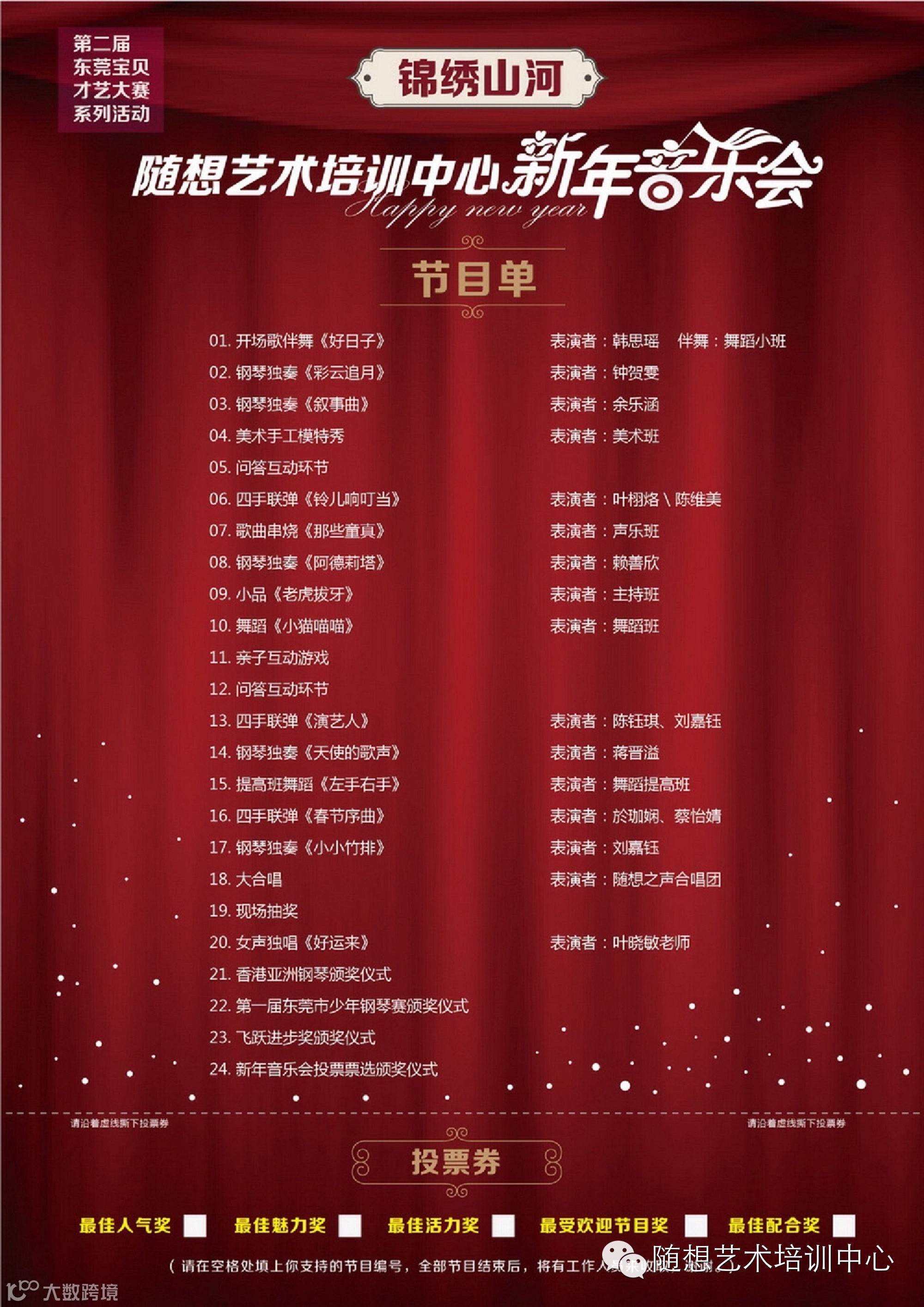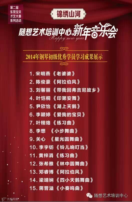 东莞报业传媒集团联同随想艺术培训中心将于2014年12月27日下午2:30分,在松山湖锦绣山河会所隆重举行“东莞宝贝”主题公益迎新音乐会。届时活动内容形式多样,奖品礼品丰富,欢迎大家前来参加!