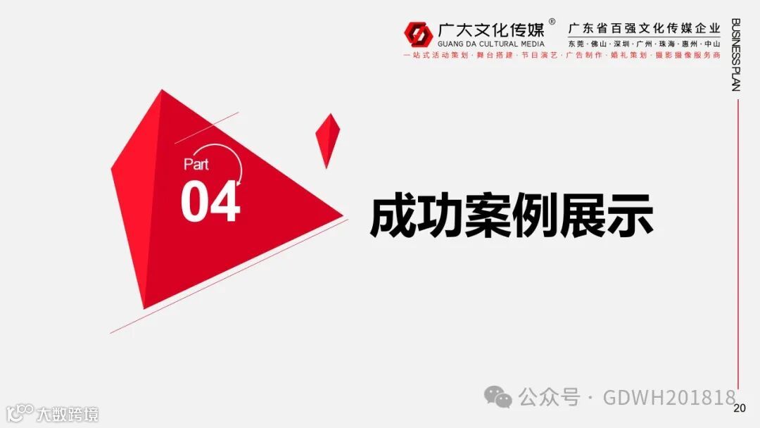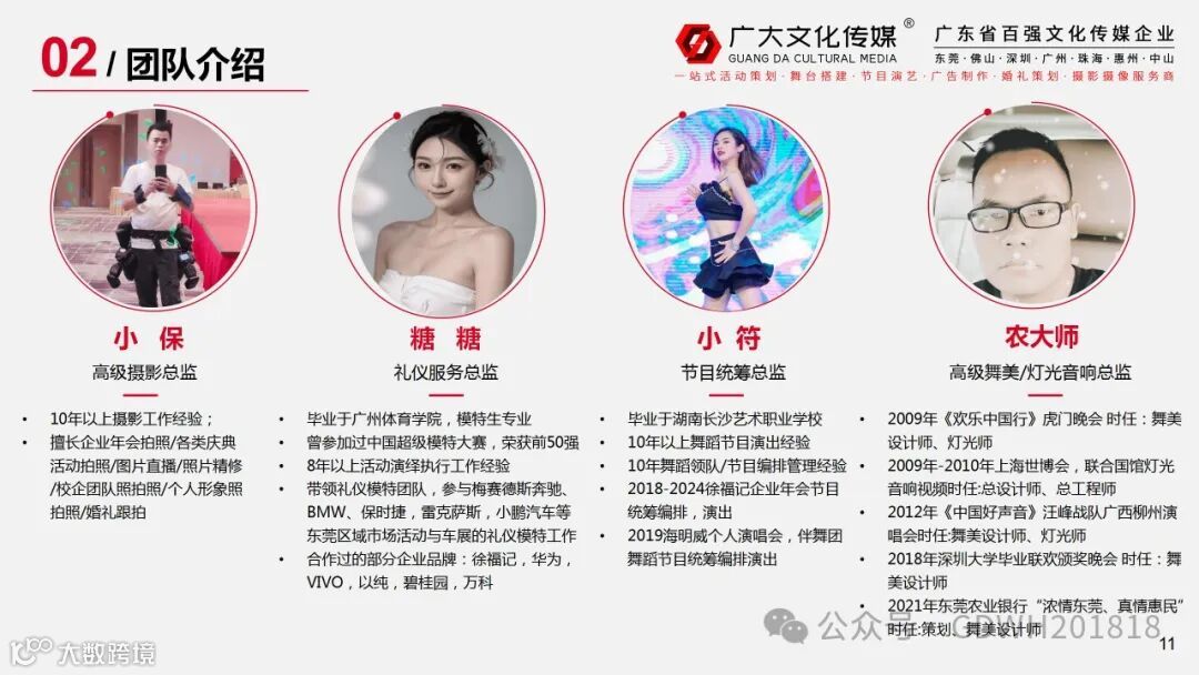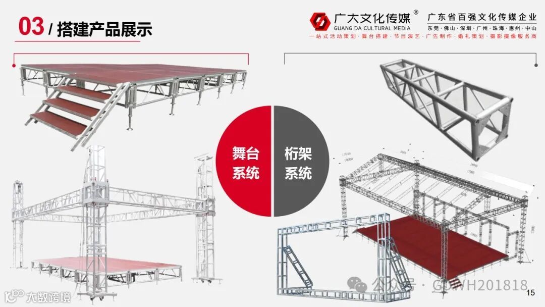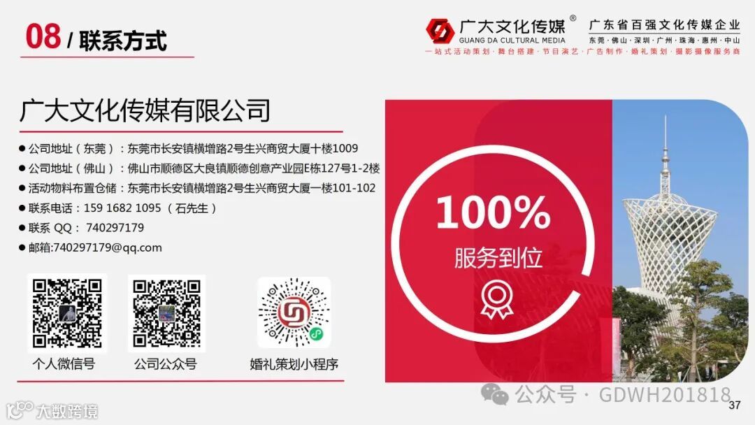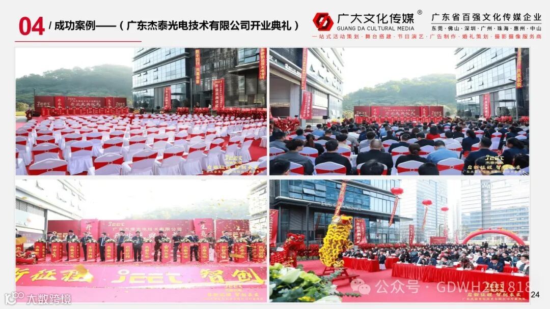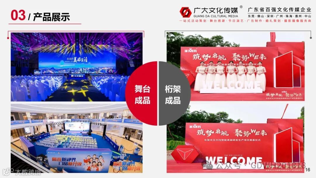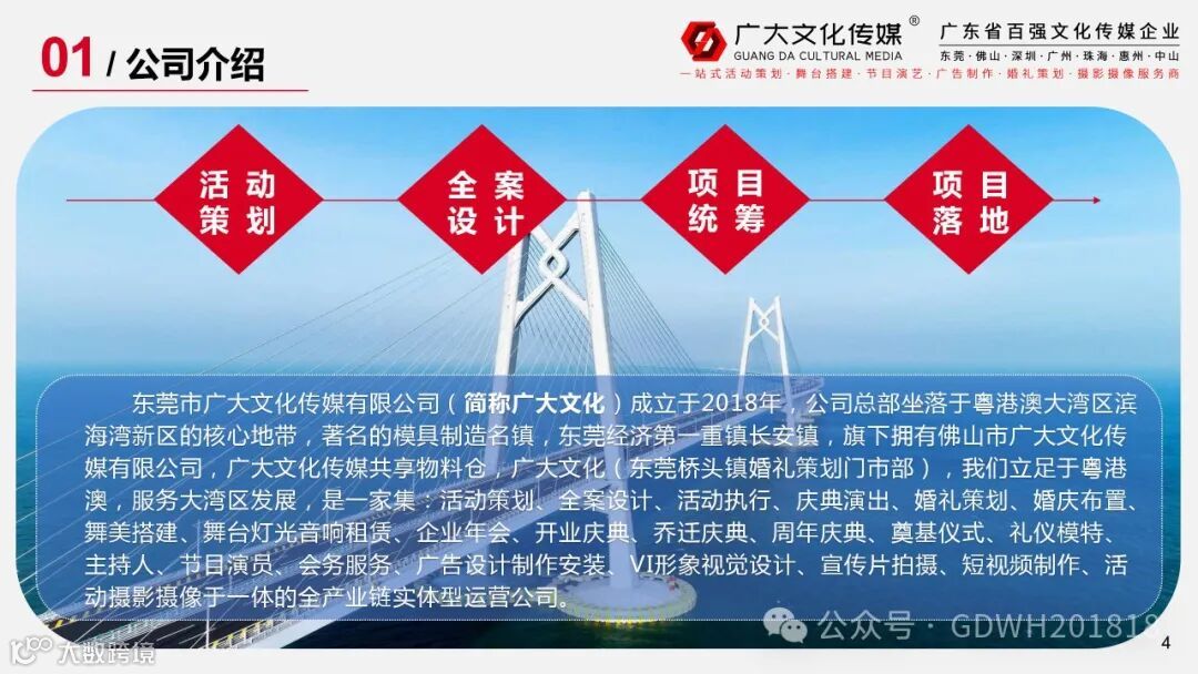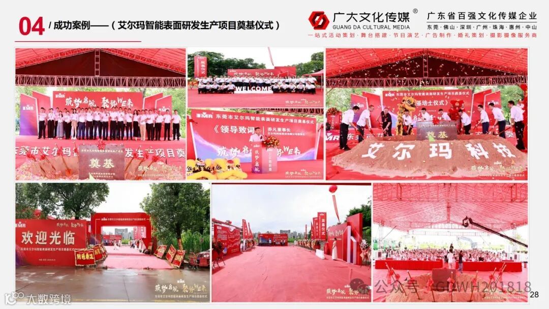 东莞市广大文化传媒有限公司 专注于全案策划、庆典活动、会务服务、活动执行、商业演出、舞台音响灯光LED屏租赁、演员演艺、摄影摄像、企业宣传片拍摄、婚庆策划、庆典物料出租服务