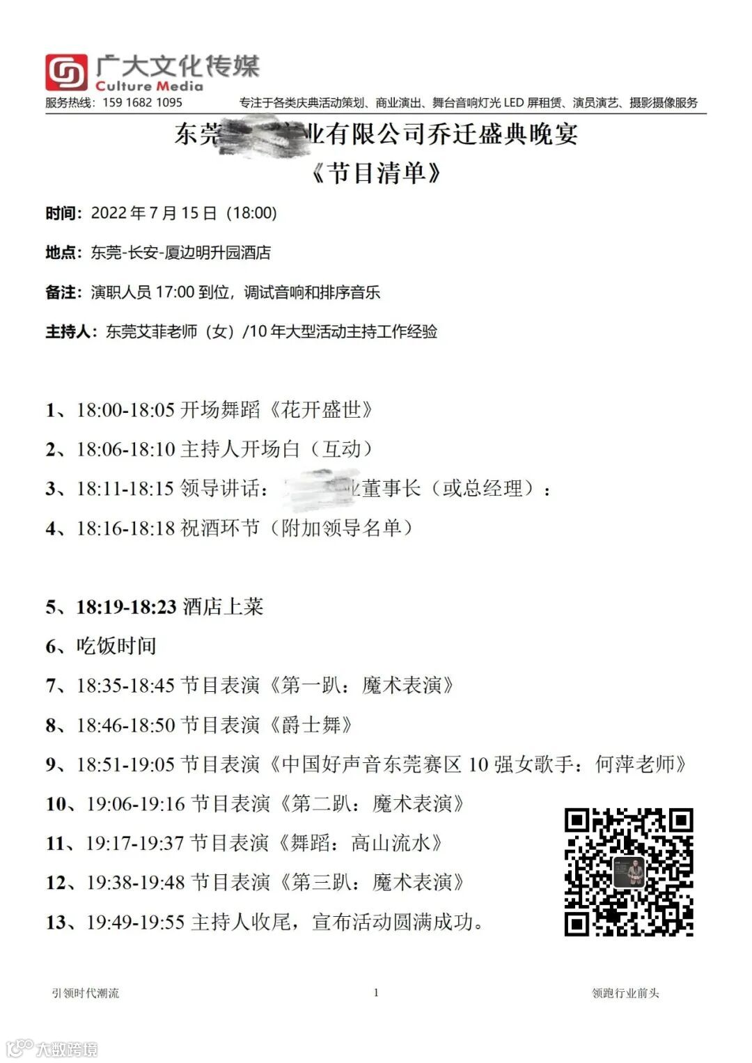 东莞市广大文化传媒有限公司为统一并管理好我司的工作规范,为客户提供一份专业并清晰的部分《节目流程表》,让客户一目了然,省去一定的沟通协调时间,特制定了这份统一标准化的《节目流程表》模板,具体如下:(注明:文件模板要统一,但是节目内容可根据客户需求而定)