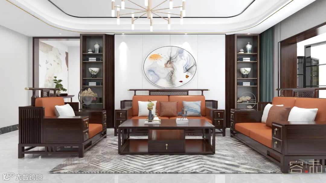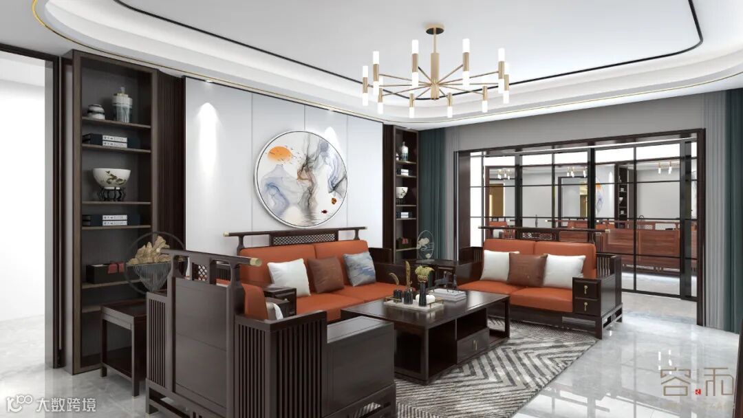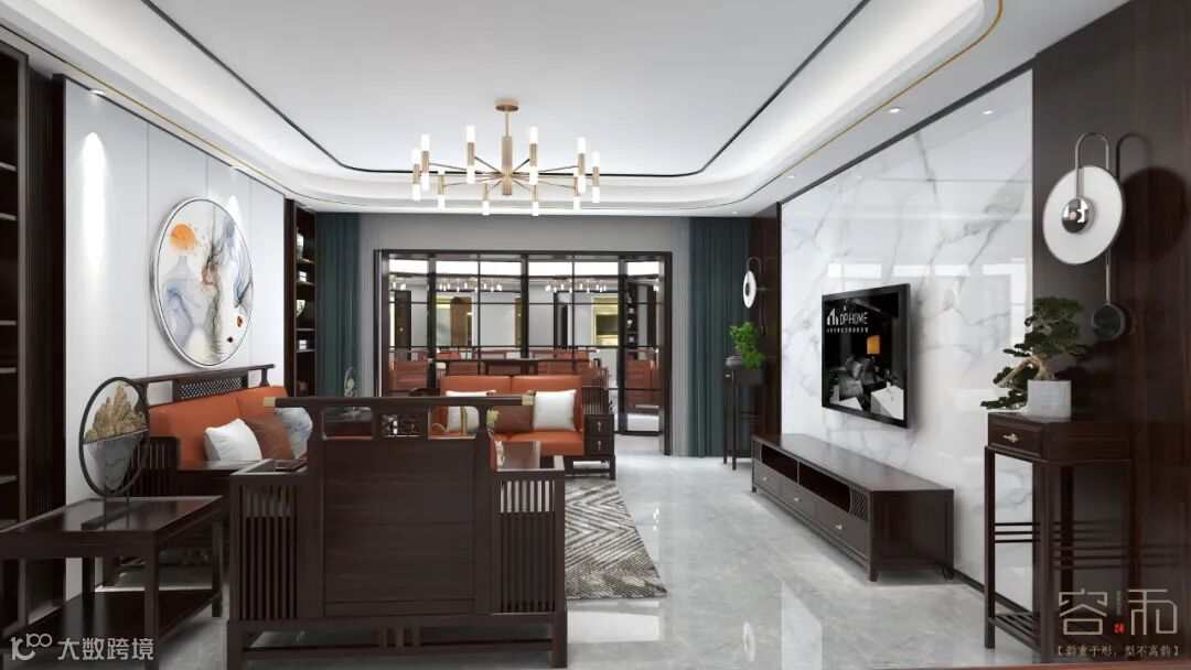 客厅的软装以原木色为主,灰色、白色为辅,皮艺搭配原木、金属,视觉上中式韵味带有轻奢感,整个空间都散发着一种宁静安详的美感;