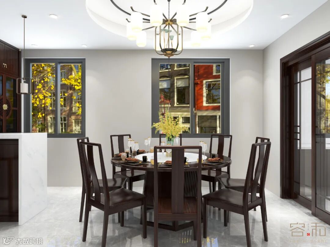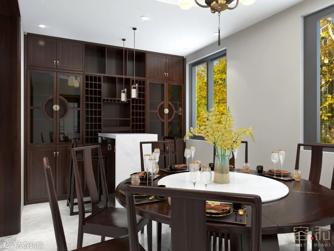 餐厅挑选精美的餐椅搭配,背景整体性,装饰品点缀,增加置物柜,使功能更加完整性。