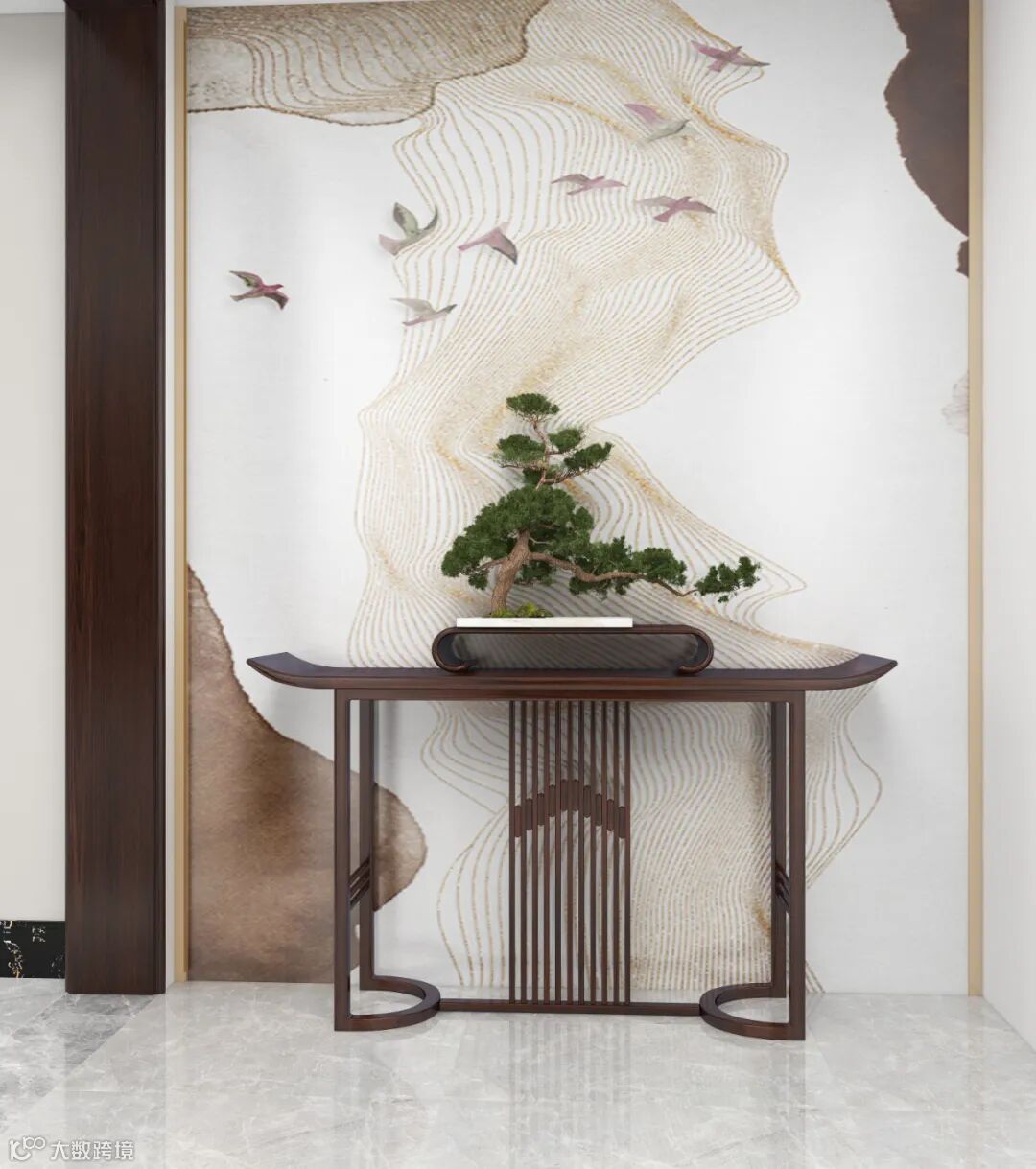 踏入玄关之中,能够感受现代水墨画的山水之韵,再搭配中式条案元素的修饰,入户感让人心动不已。