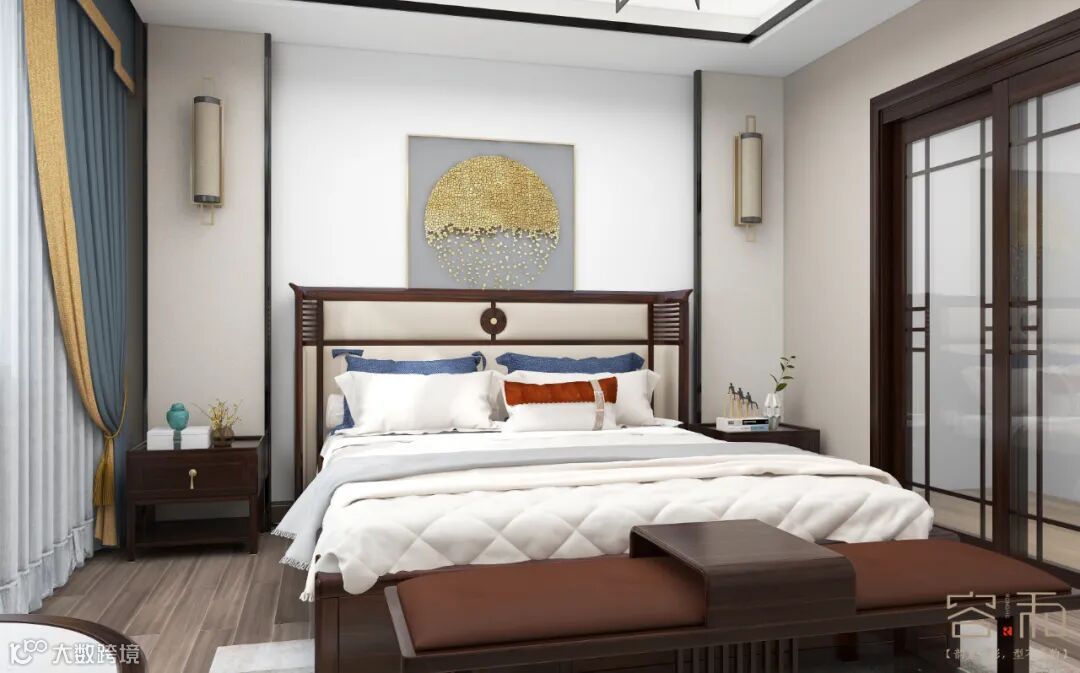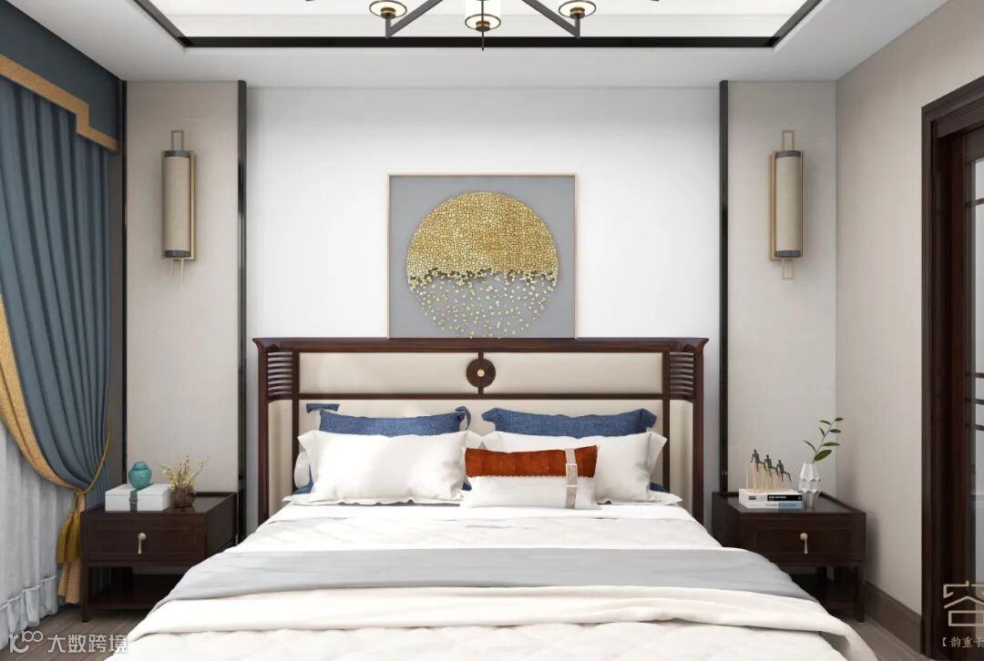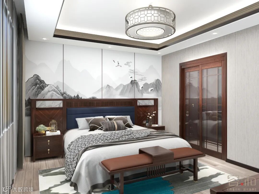 主卧整体色调柔和,木色和白色的主色调给人舒适的空间感,浅调的水墨山水床头背景成为了整个空间的过渡和衔接,更显示了精致优雅的新中式风格韵味。