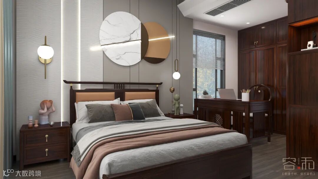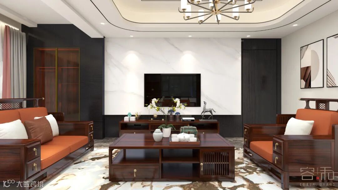 这套方案是以新中式为设计思路,充分展示中式文化与现代工艺的结合,客户要求体现中国文化,但是不要一味的照搬传统文化,在此基础上,设计师充分理解了客户的想法后,以黑檀木色为色调设计了这套方案。