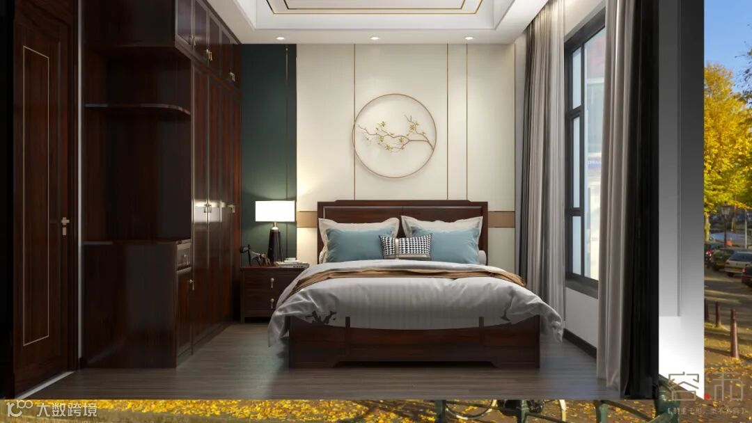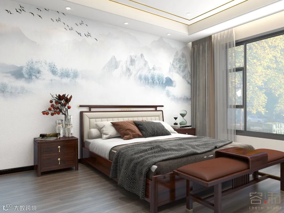 主卧背景墙选中式水墨山水壁布,床屏选用真皮床屏,吊顶是无主灯设计,丰富了空间的层次,凸显沉稳、低调的气质。