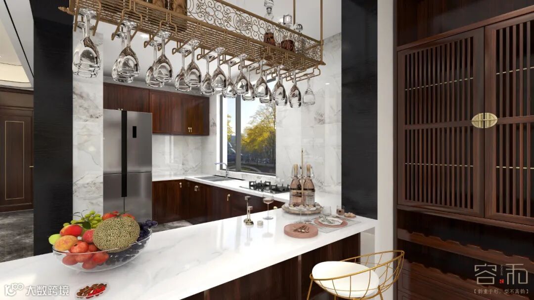 厨房采用开放式厨房设计,和餐厅连接起来,这样整体空间显得比较通透。在餐厅和厨房中间设计了休闲吧台,既可以当做吧台使用,又可以当做备餐台,在吧台上方设计了金属酒杯架,和吧台相互辉映,这样厨房和餐厅两个空间独立又统一,隔而不断。