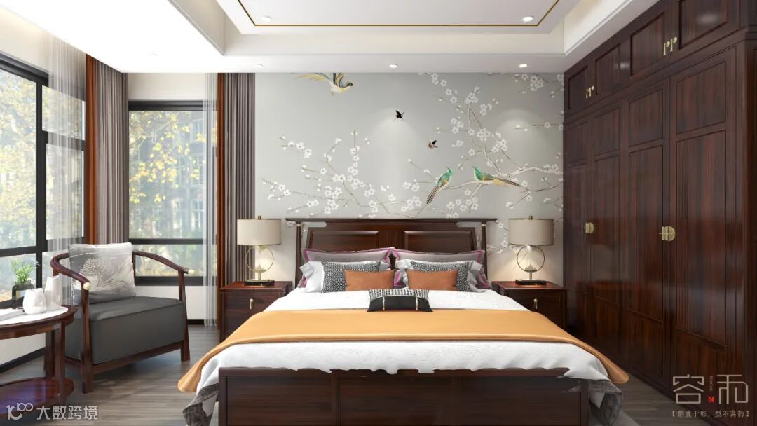 老人房背景墙选用喜鹊登枝的传统图案,体现老年人对传统文化的崇敬,这个图案也比较沉稳,沉静,是一种生活态度和生活方式的表达。