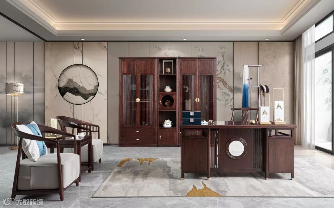 书桌一般是方方正正的置于柜架前,椅子是常见的宽大圈椅,椅背线条优美。