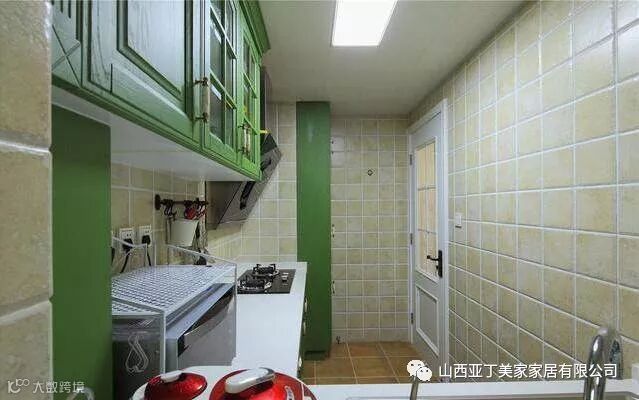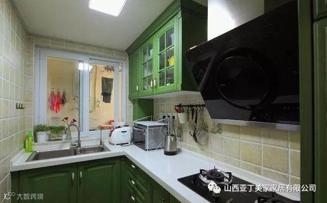 厨房部分是L形的设计,比较狭长的,橱柜是绿色的,感觉还好,不是很深的颜色。